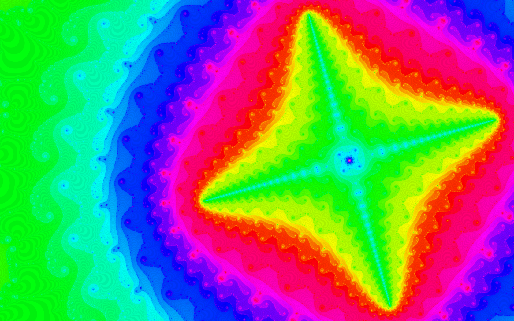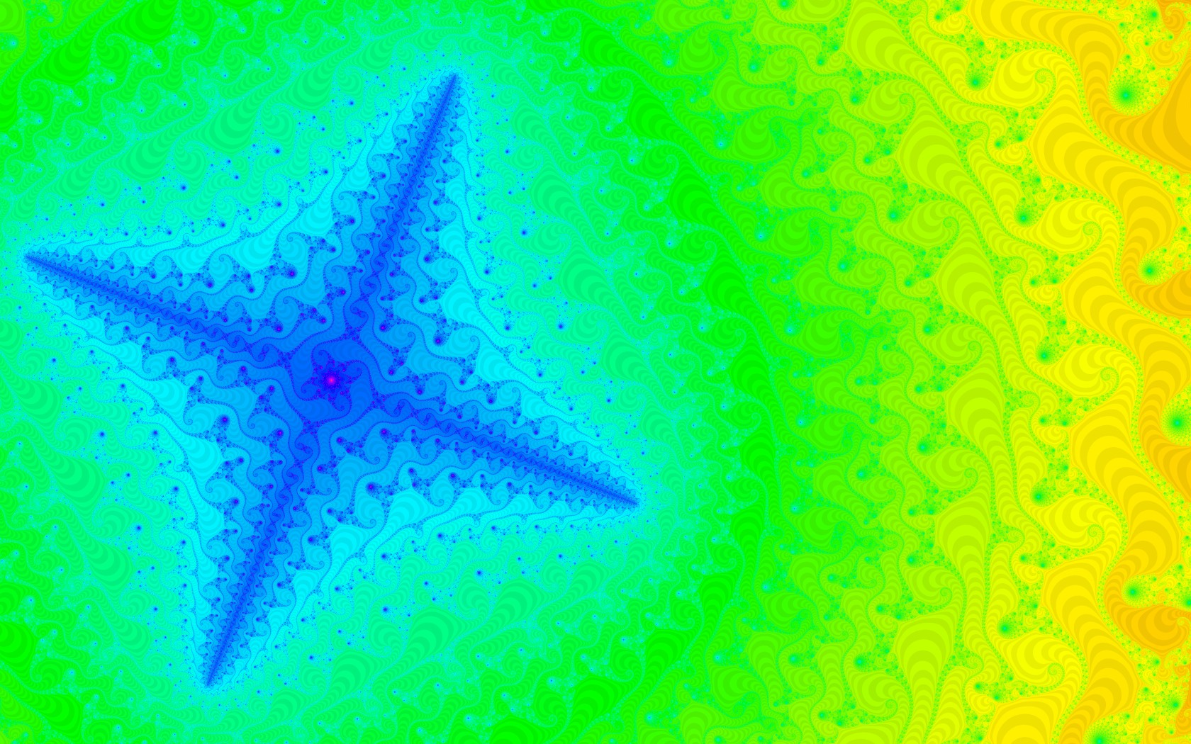 These stars really are a meta shape; i.e. they arise not so much naturally from the fractal's formula, but can be found almost everywhere if you zoom deep enough and do so very selectively. Around 500 bits of precision were needed for the examples above, and roughly a week of processor time each for the large, anti-aliased versions. Multicore machines to the rescue! :-)
